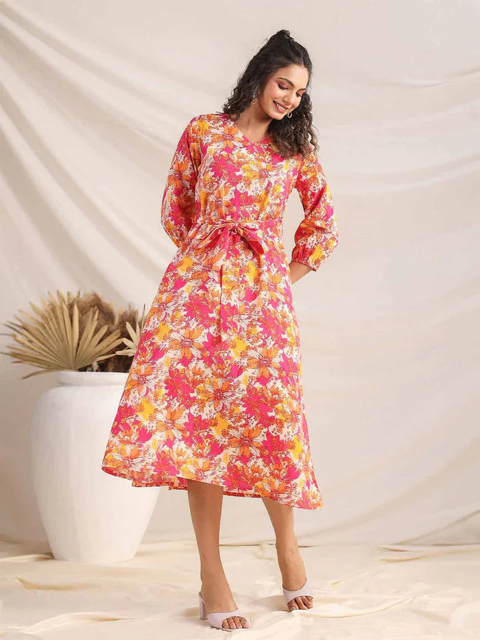 The Boho Floral Dress is a vibrant burst of summer style. Its playful floral patterns in a kaleidoscope of colors create a cheerful and feminine look. The flattering A-line silhouette ensures comfort and style, making it perfect for casual outings or garden parties.