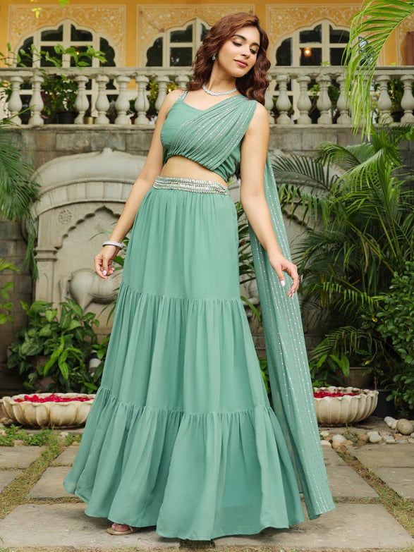 Green Georgette Lehenga with Tiered Sequins Choli Set