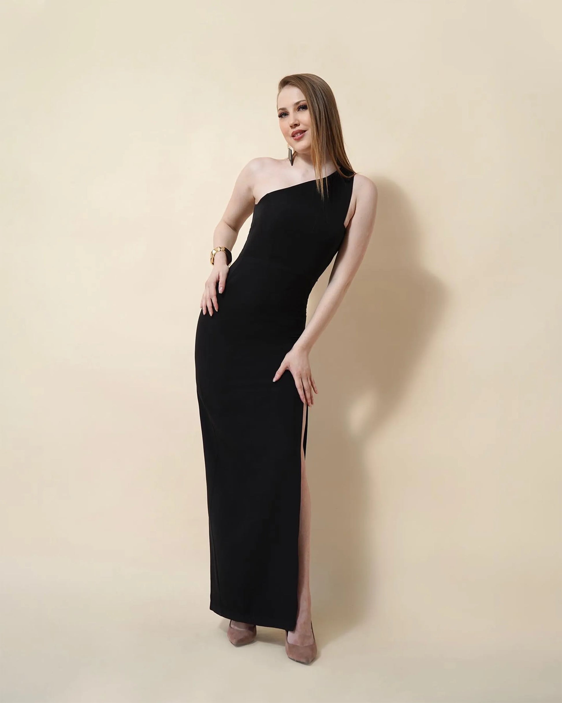 Make a dramatic entrance in the Kyle One-Shoulder Long Gown. This stunning evening gown features a captivating one-shoulder neckline that elegantly drapes across your body, highlighting your collarbone and shoulders. The flowing, full-length skirt adds a touch of romance and grace.