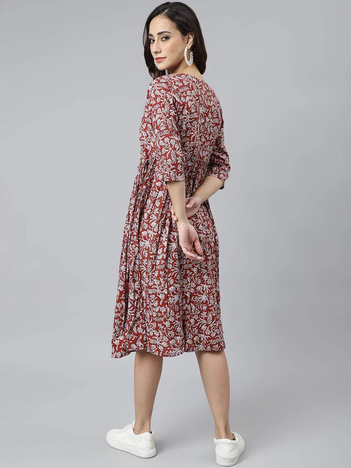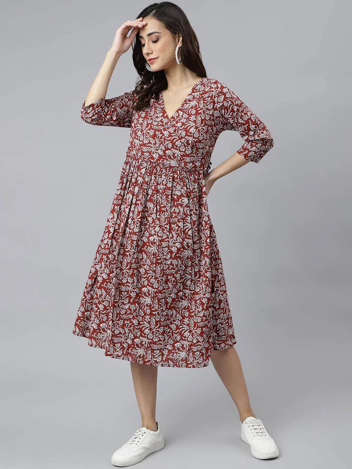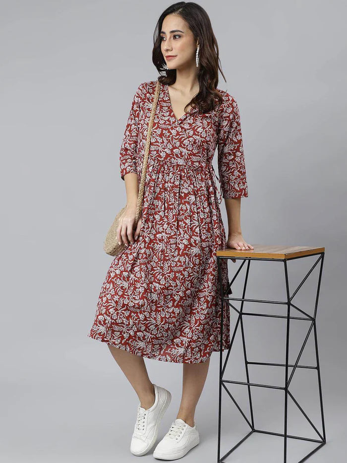 Crimson Floral Tier is a captivating Indo-western dress that effortlessly blends tradition with modern style. Its rich maroon hue, adorned with vibrant floral prints, creates a striking visual appeal. The tiered design adds a playful and feminine touch, making it perfect for both casual outings and festive occasions.