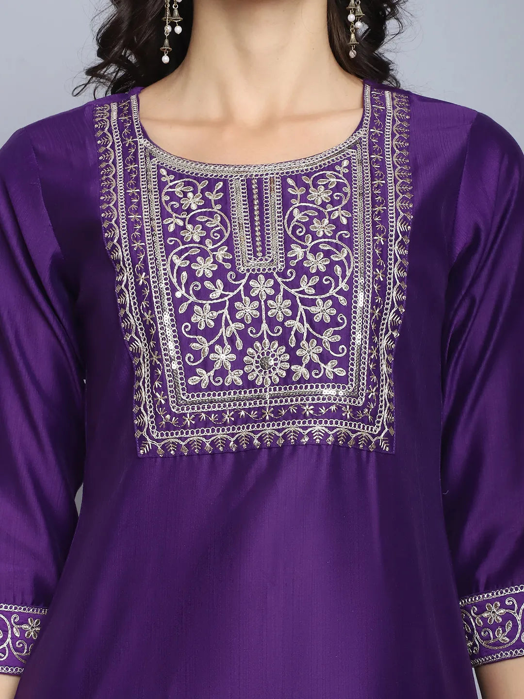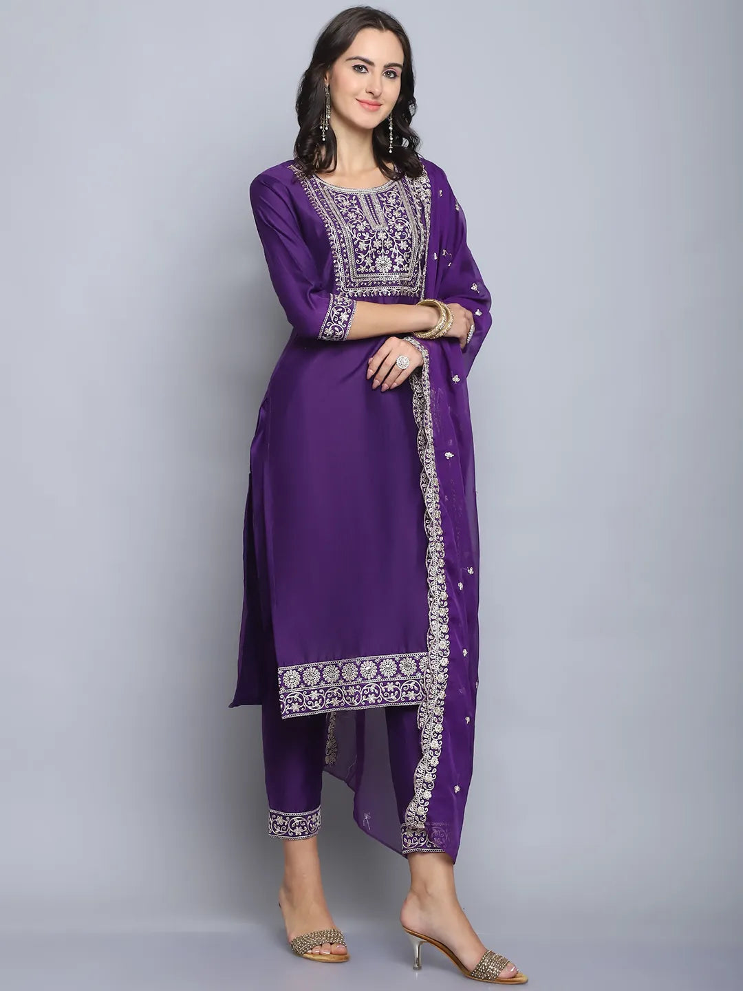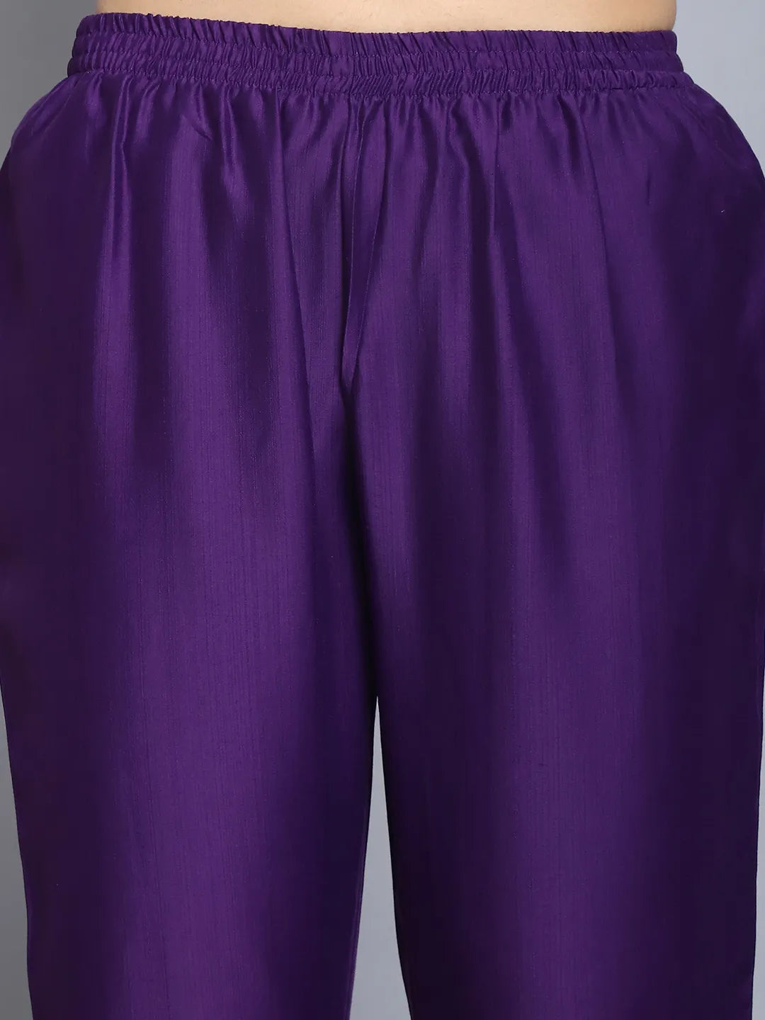 Elevate your ethnic wardrobe with this Purple Embroidered Silk Kurta Set, a perfect blend of elegance and tradition. Crafted from luxurious silk, the kurta features intricate embroidery, adding a regal touch. Paired with matching pants and a gracefully flowing dupatta, this ensemble is ideal for festive occasions and celebrations. Style it with statement jewelry for a timeless look!