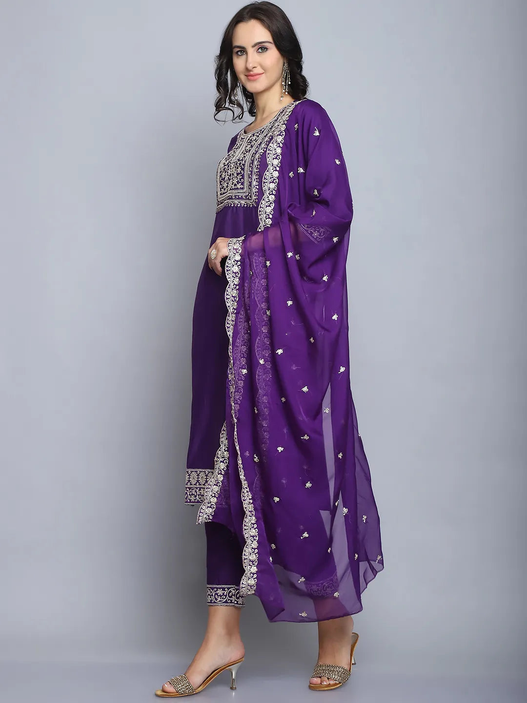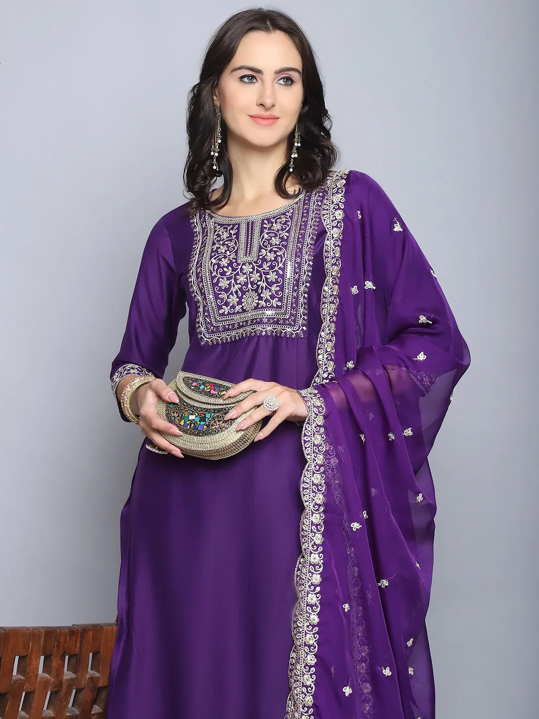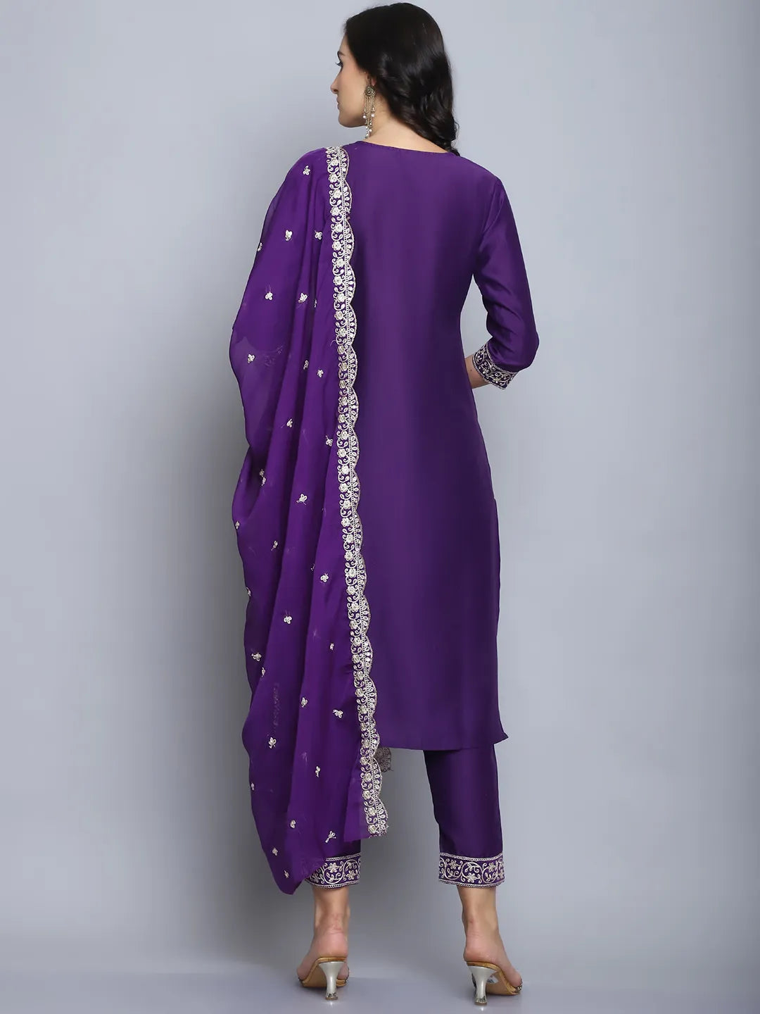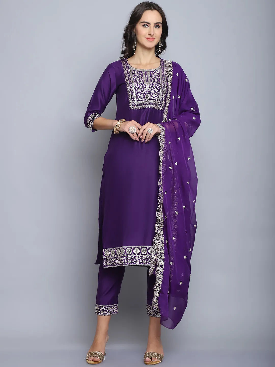 Elevate your ethnic wardrobe with this Purple Embroidered Silk Kurta Set, a perfect blend of elegance and tradition. Crafted from luxurious silk, the kurta features intricate embroidery, adding a regal touch. Paired with matching pants and a gracefully flowing dupatta, this ensemble is ideal for festive occasions and celebrations. Style it with statement jewelry for a timeless look!