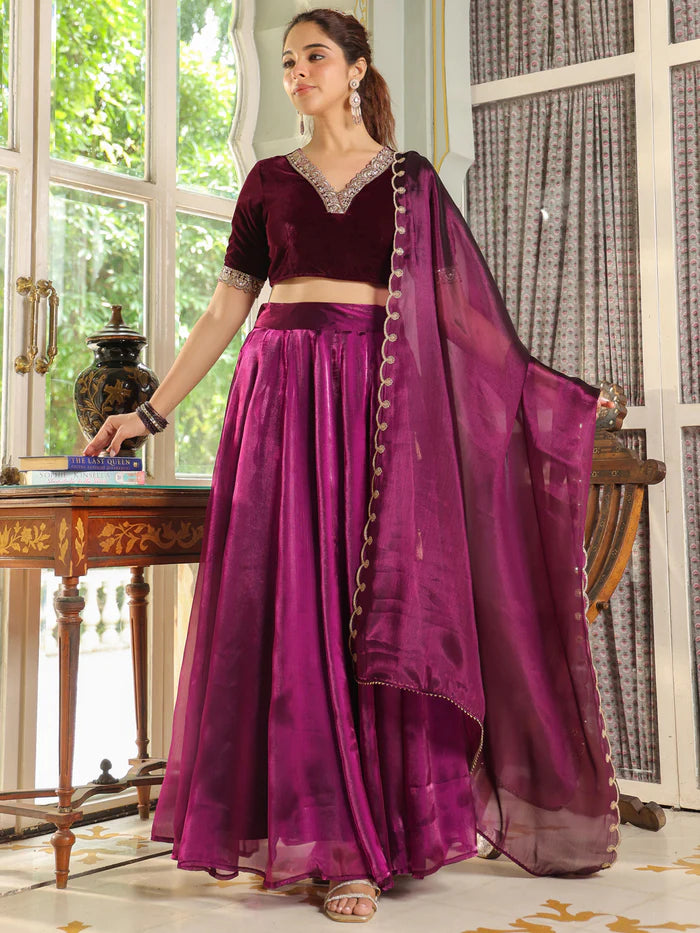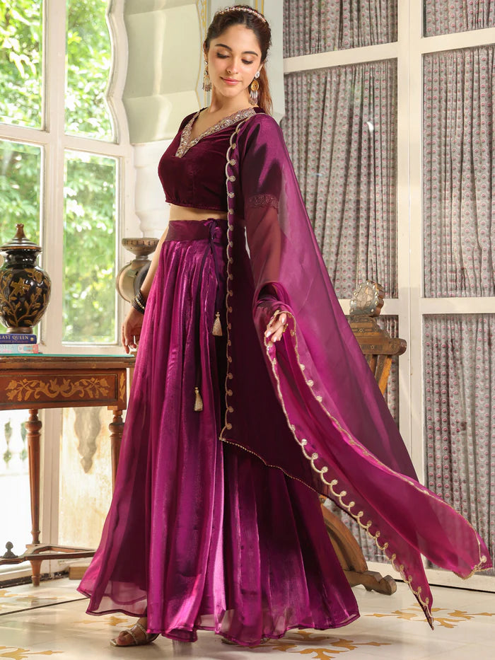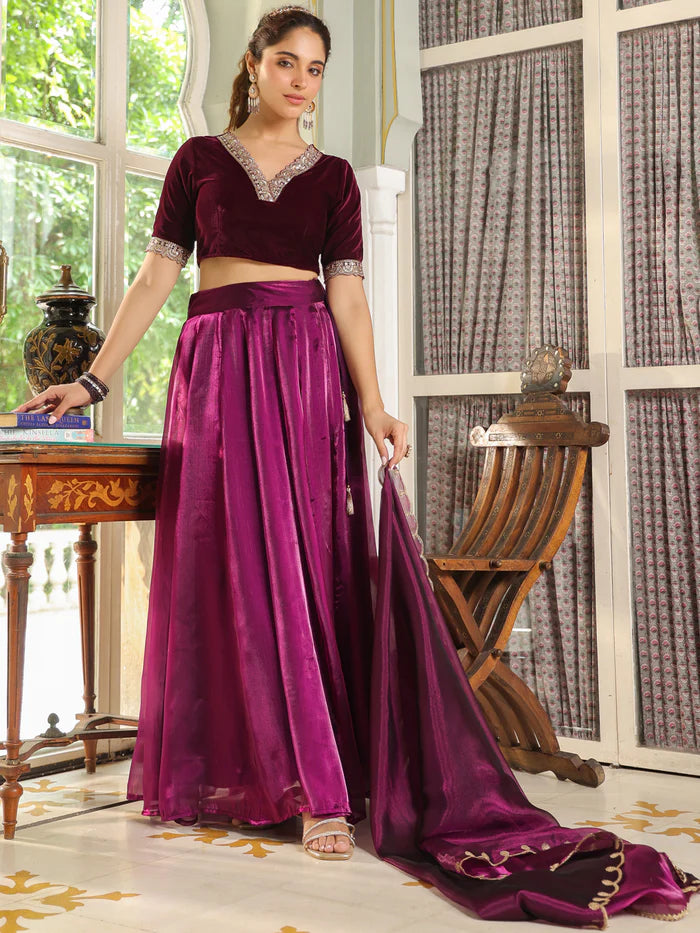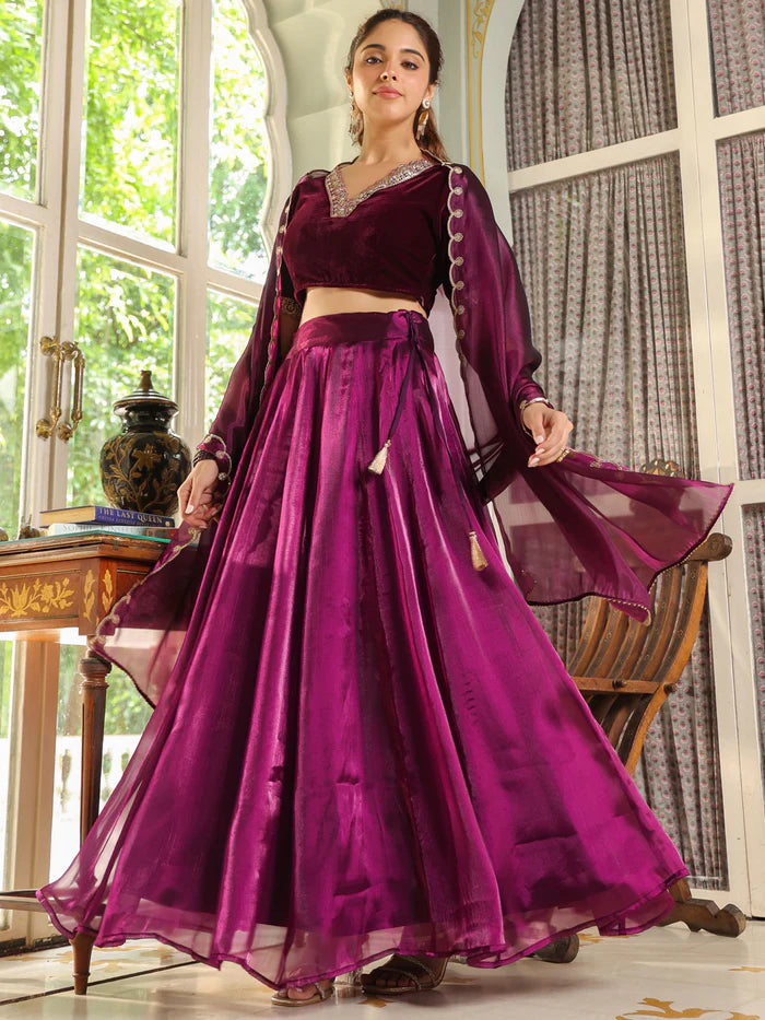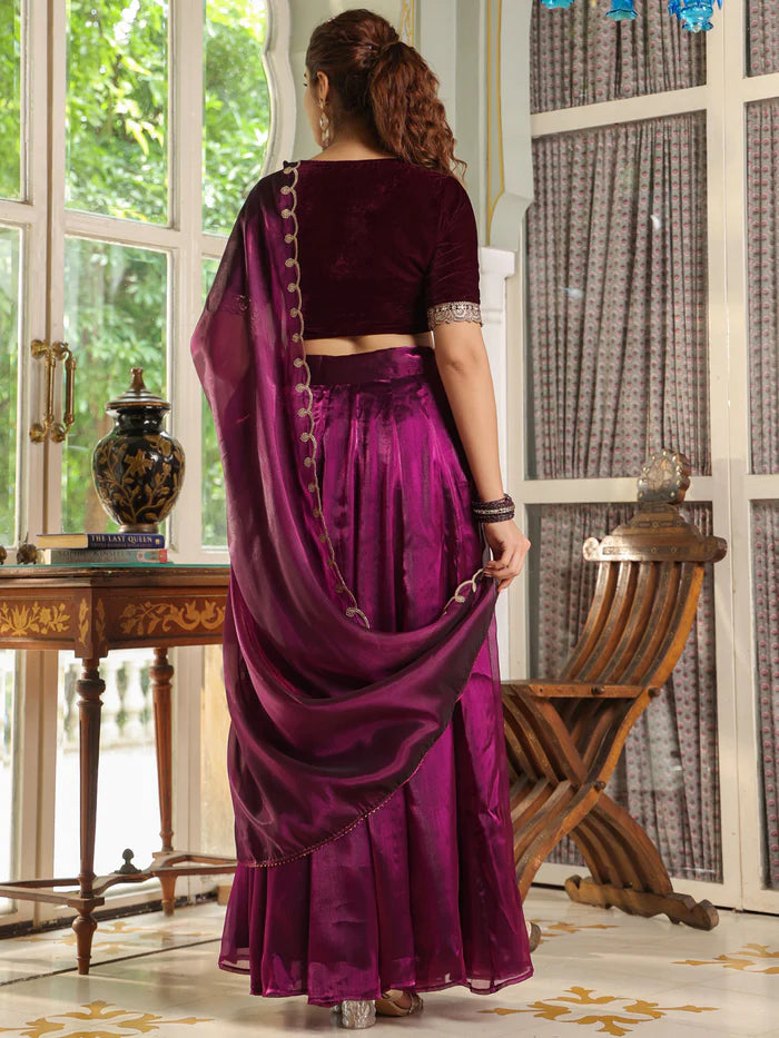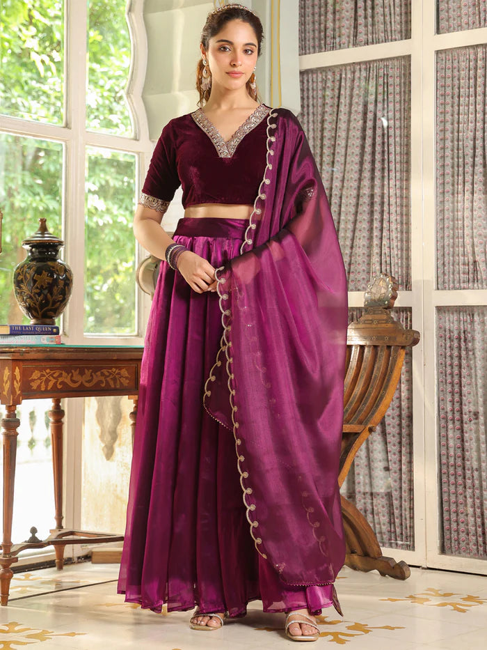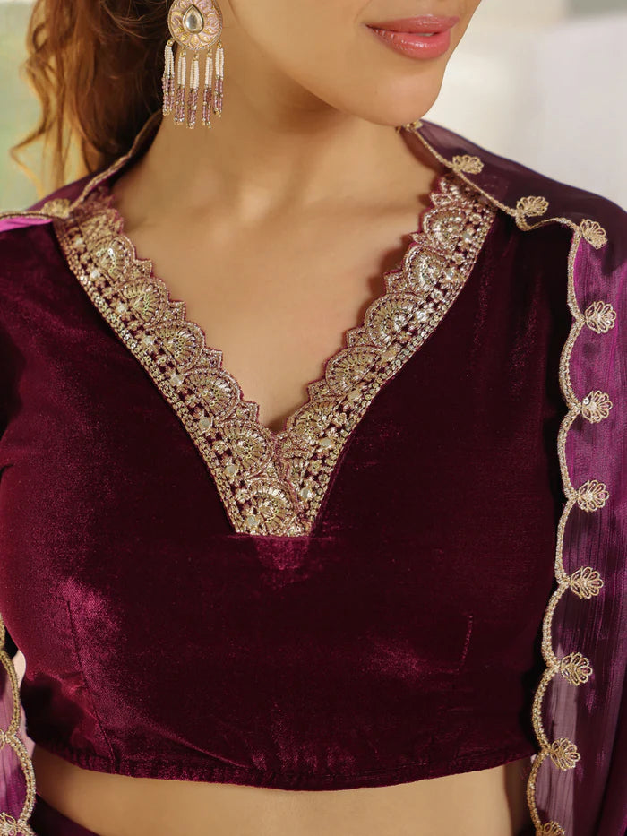 Purple Velvet Blouse with Organza Zari Embroidery Lehenga Set