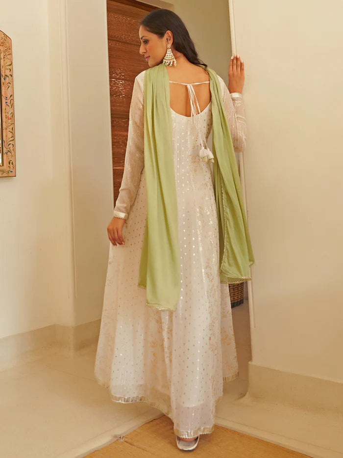 The Glamorous White Kurta Set is a dazzling ensemble that exudes elegance. Crafted from luxurious chiffon and adorned with shimmering lurex foil prints, this set is perfect for special occasions. The delicate fabric and intricate details create a sophisticated and feminine look, making it a standout choice for any event.