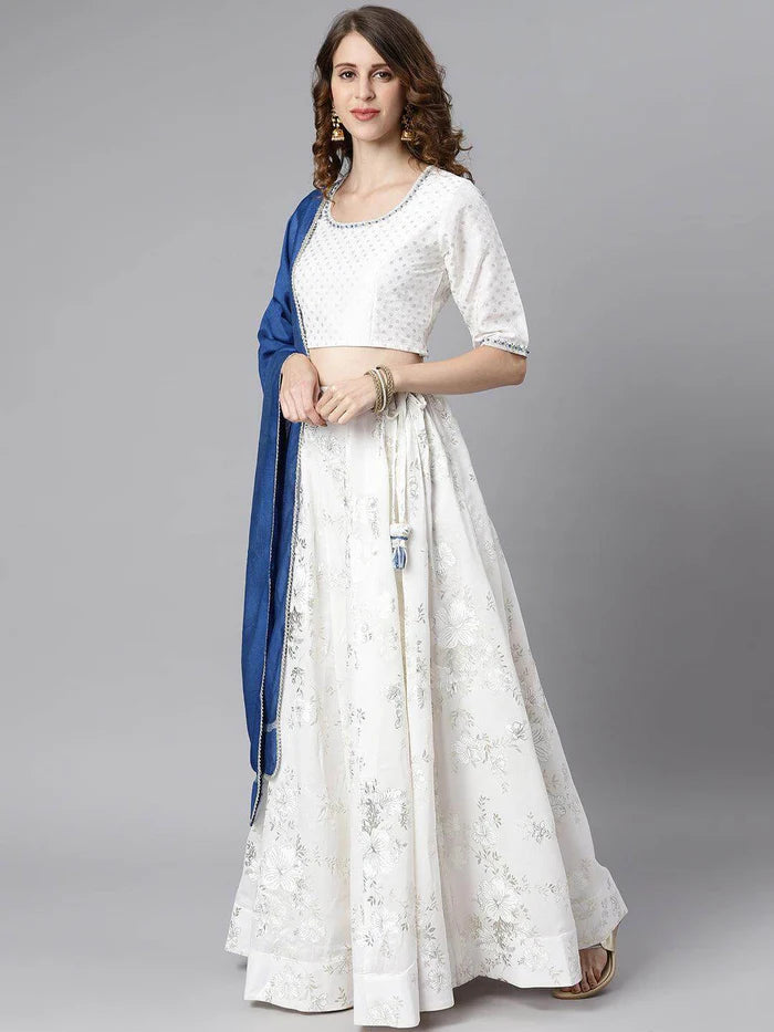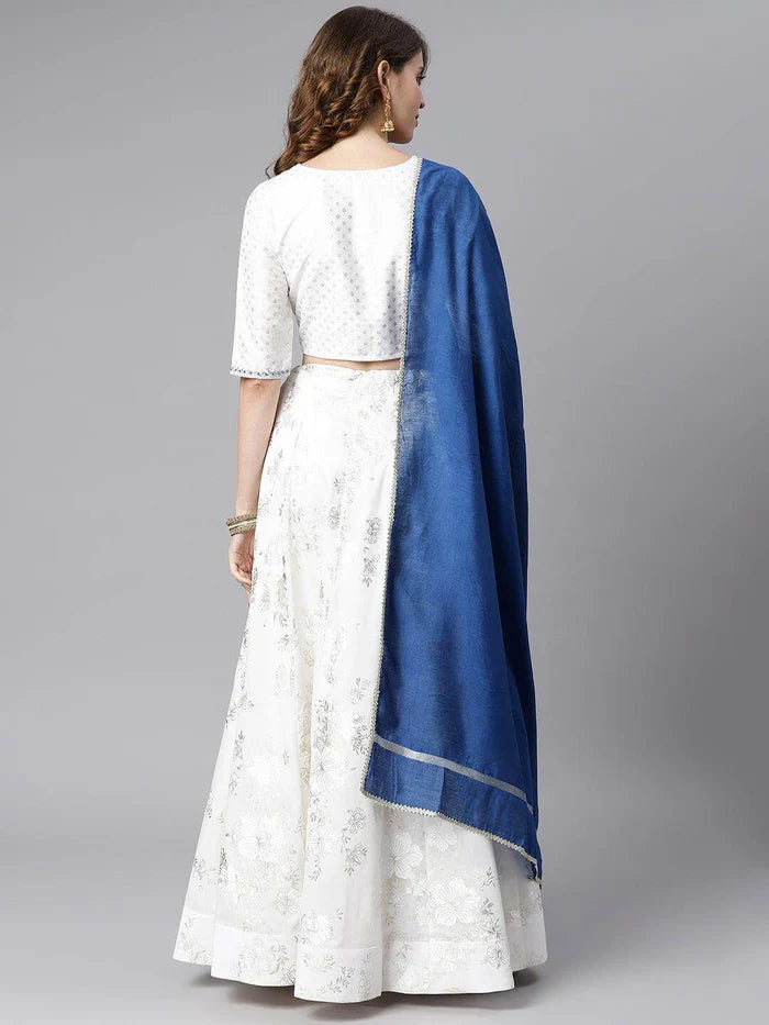 The Juhi Lehenga Choli Set is a graceful ensemble crafted from luxurious poly silk. The pristine white canvas is adorned with delicate floral patterns, exuding a timeless elegance. Perfect for weddings, receptions, or any special occasion, this set offers a blend of traditional charm and modern sophistication.